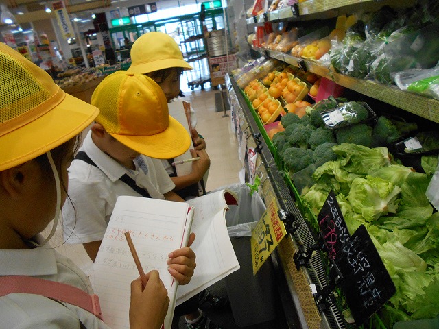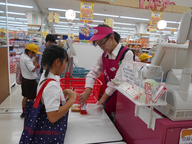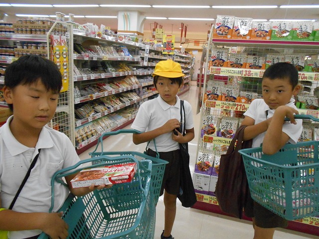 3年生は、近くの大型スーパーに校外学習に行き、店の工夫などの勉強をしました。各自300円をもち、家の人から頼まれた買い物もしました。