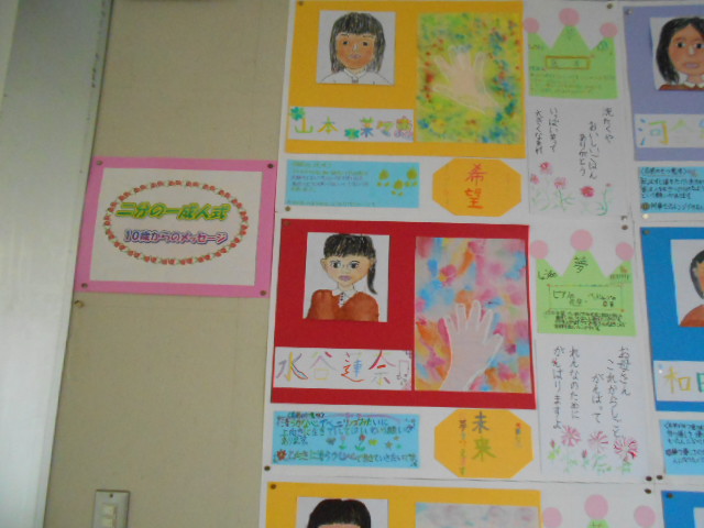 ギャラリーには、4年生の作品が掲示されました。二分の一成人式に向けて、自分の名前の由来や夢を書きました。家の人からのメッセージも心温まるものがたくさんあります。