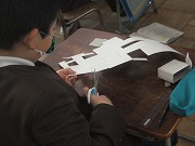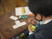 2年生が算数で厚紙の立体サイコロを作っていました。サイコロは12本の辺がすべて同じ長さで、6つの面がすべて同じ大きさの正方形です。