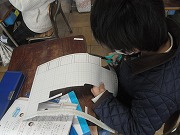 同じ大きさの正方形を6枚作るのに、正方形同士をつなげて書くと、切るときに少しでもずれたらへこんだ正方形になってしまうかもしれません。ほとんどの子たちは、すべての正方形をばらばらに描いて切り取っていました。