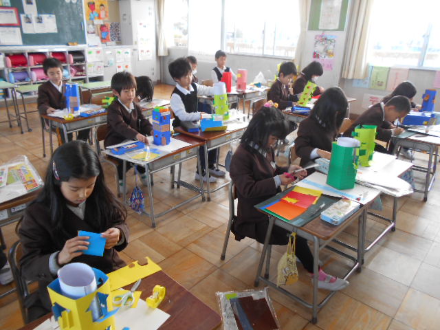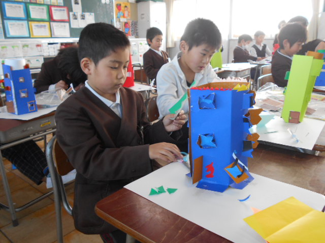 2年2組は、図工「まどをひらいて」の作品作りをしました。はさみを上手に使って工夫した作品を作っています。
