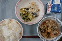 ご飯 牛乳 鱈の味噌クリームチーズ焼き 磯香和え がめ煮
