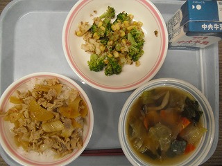 キムタク丼(麦ご飯) 牛乳 花野菜のおかか和え 海老と春雨のスープ