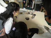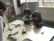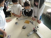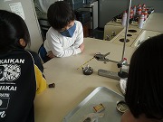 4年生が理科で、ものの温まり方の実験をしていました。金属板や金属の棒がどのように温まっていくのか調べます。金属には示温テープ(温度によって色が変わるテープ)が貼ってあり、どのように温度が変わっていくかがわかります。金属板の形を変えたり金属棒のかたむきを変えたり、条件によってどのように温度が伝わるのか確かめていました。