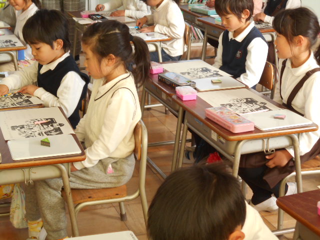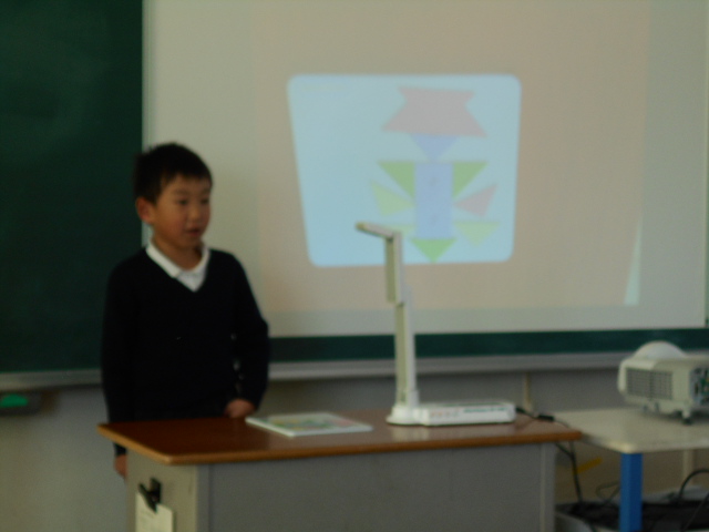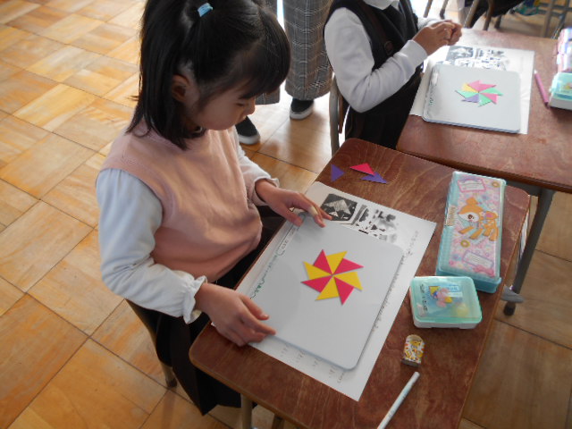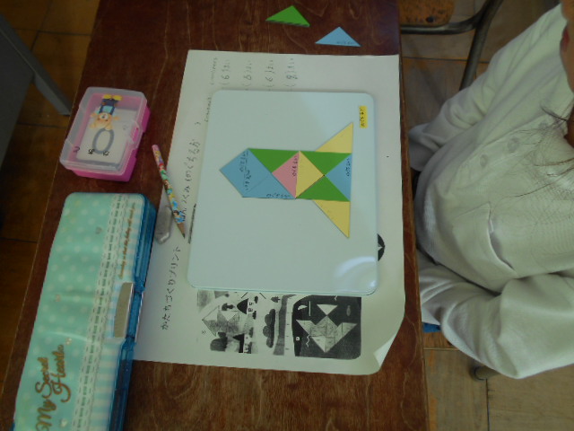 1年生は、算数でかたちつくりの勉強をしました。いろいたを使って、家・風車・ヨット・魚を作りました。最後は、自分で考えた形を作り、発表しあいました。