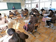 6年生が音楽で滝廉太郎の曲の鑑賞をしていました。感染リスクが高まるために合唱はもちろん道具類の共用も避ける必要があるためです。