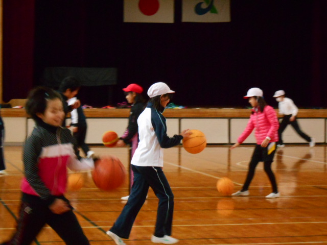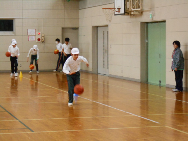 6年生は、バスケットボールを使って、ドリブルの練習です。ドリブルしながらじゃんけんをしたり、向きを変えたりしました。