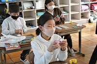 3年生がストローと洗濯バサミを使ってゴム鉄砲を作っていました。ストローをテープでつけたり切ったり曲げたりと順に作っていくとゴム鉄砲になるそうです。うまく作れるかな?