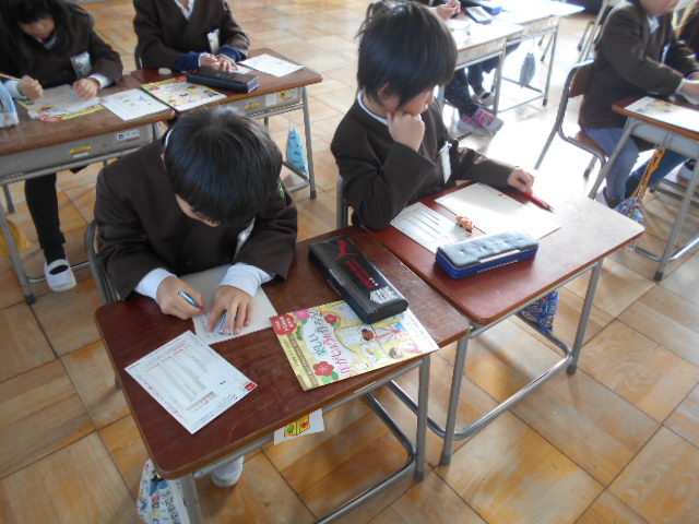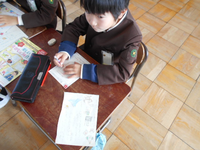 2年生は、年賀状を書きました。裏には、自分の手形をとり、表には住所の書き方を覚え、丁寧に仕上げます。