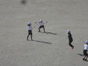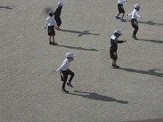 1年生が体育で縄跳びに取り組んでいました。縄を8の字に回したり、足じゃんけんのグーパーのように閉じたり開いたりしながら跳んだり、片足跳びをしたりといろいろな跳び方に挑戦していました。