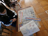 1年生の「ぐにゃぐにゃだこ」ですが、デザインはほぼ完成し、色塗りに入りました。まずはしっぽからです。子どもたちはしっぽでも手を抜かず、集中して細かく塗っていました。