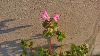 この花は「ホトケノザ」といいます。丸い輪のように見える葉っぱ(本当は二枚の半円の葉っぱが向かい合わせになっている)が、仏様の座っている台座に似ているという事から名付けられたそうです。そういえば以前奈良の