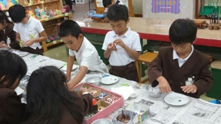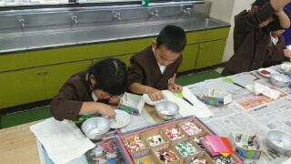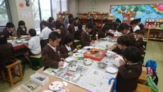 自分で紙を切ったり、最初から作ってある小さなかけらを使ったりして、お皿をデザインしていきます。