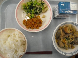 ご飯 牛乳 人参そぼろふりかけ 筑前煮 水菜のカリフラワーのピリ辛和え