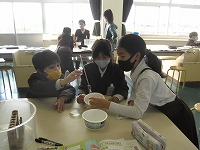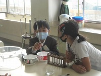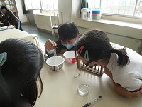 4年生が理科の空気の実験で、空気の入った試験官を温水と冷水に交互につけて、空気がふくらんだりしぼんだりすることの実験をしていました。試験官につけたゴム栓には細いガラス管がさしてあり、ガラス管の中には、ほんの少しだけ水があるので、子どもたちは、空気のふくらみに合わせて水滴が動くのをじっと観察していました。