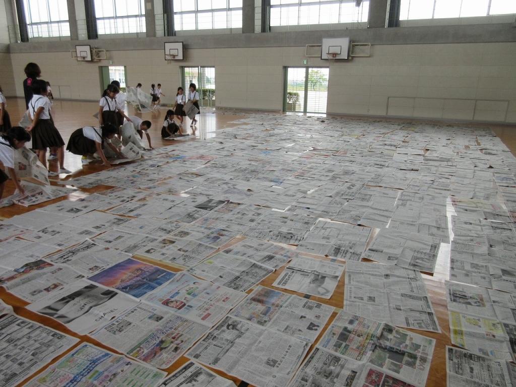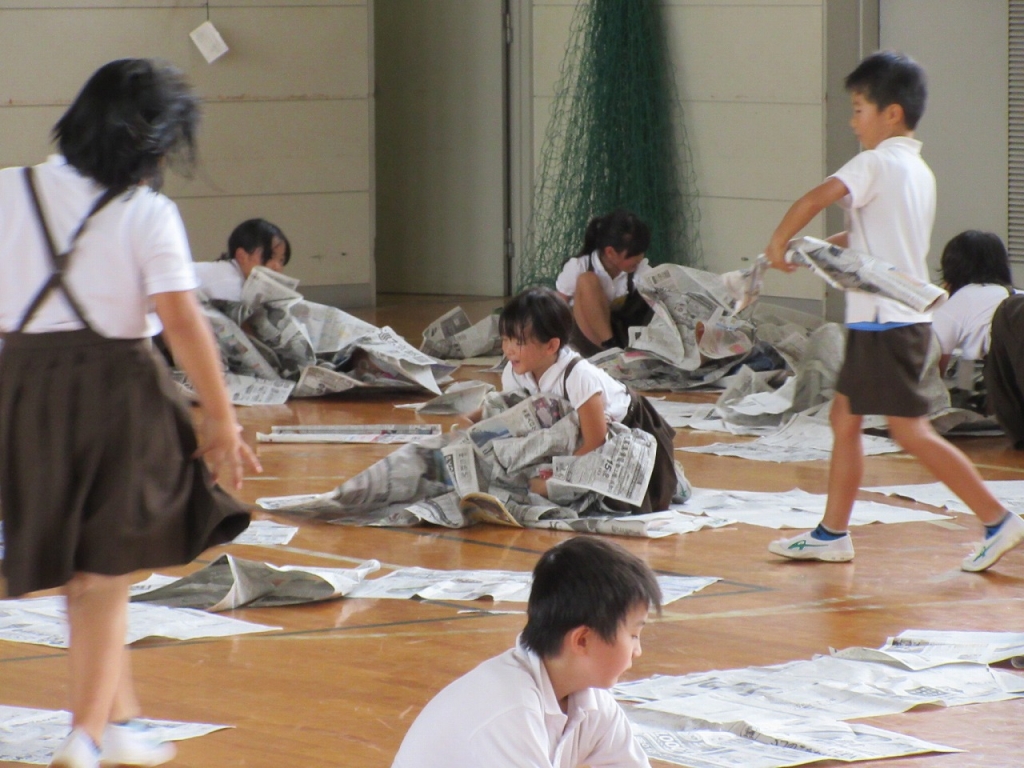2年生は、図工の時間に新聞紙を使って、体育館で活動しました。子どもたちは、新聞紙で自由に物を作ったり、新聞紙の特徴をつかんだりして、新聞紙となかよくなりました。