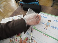 手を数分間、布で覆ったりビニール袋で覆ったりして、感じ方の違いを比較しました。透明なビニール袋は、少したつと中がうっすらと白く曇ってきて水分を感じました。子どもたちは、ビニールはべたべたするとか蒸し蒸しするなどの感想を挙げていました。