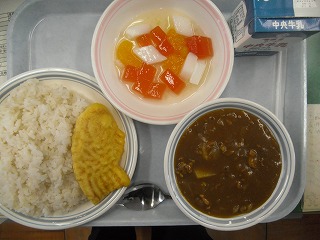 今日の給食は、広島県呉市の海上自衛官の補給艦「とわだ」のカレーライスをイメージして作りました。隠し味に桃が入っています。今日は木曜日ですが、海上自衛隊では長い航海で曜日感覚を失わないため、毎週金曜日にカレーを食べるそうです。