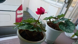 西川端小学校の職員玄関に二鉢あったシクラメンがまた葉を出して、ついに花を1つ咲かせました。