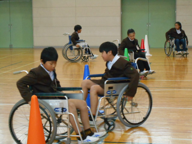 5年生は、福祉実践教室を行いました。車いすと視覚ガイドの体験をしました。