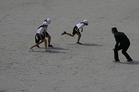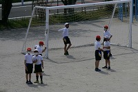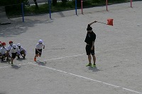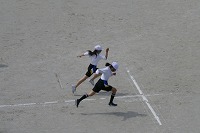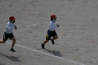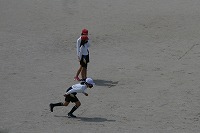 5年生が体育で50m走の練習をしていました。まず走ってみて、どうすればタイムが向上するか、スタートの仕方や走る姿勢など、友達同士で確認したり相談したりして工夫します。