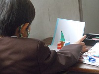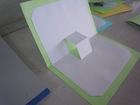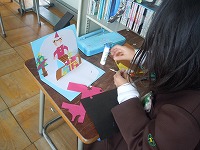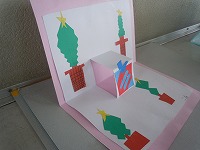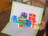 2年生が、折りたためる立体のクリスマスカードを作っていました。半分に折った画用紙に2本切り込みを入れて、その部分だけ反対に折ると、飛び出してきます。その飛び出した立体部分や背景部分に折り紙などで飾りつけをします。
