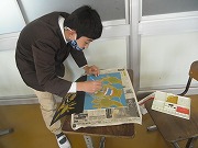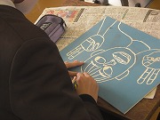 板を彫刻刀で彫った後、紙の端を板の上の部分に貼りつけて、ずれないようにして、薄い色から順に色をつけて何回かに分けて刷っていきます。