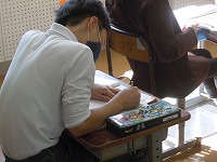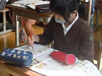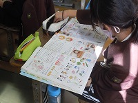 5年生が家庭科で、食事に含まれる栄養素について学習していました。赤や黄色、緑の食品群について、給食や毎日の食事と関連づけて確認していました。