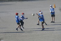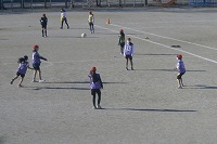6年生が体育で取り組んでいるサッカーの練習で、手を使ってパス回しをしていました。サッカーに限らずパスをしてボールを進める競技は、ボールを持っていない(オフザボール)時間に、人がいかに動いてパスをうけ、次につないでいくかが重要です。例えば目の前に相手がいても、味方が横に動けばパスを通しやすくなります。味方が動いてからパスをするのではなく、動くであろう先の方を予測してボールをパスする、いわゆる「スルーパス」は、サッカーの醍醐味の一つですね。