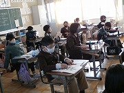 4年生が毛筆で、「出発」という字に取り組んでいました。「発」という字は「払い」の数が多く、最後の画の曲げからはねの部分は特に難しい字です。
