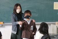 3年生が音楽で、合唱を行っていました。その曲の中に全音符が出てきます。しっかりと息を吸って長く音を伸ばす部分があります。最近ののJ‐popなどは、速いテンポで短い4分音符、8分音符が連なる曲が多く、ゆっくり音を伸ばす曲はあまりありません。ついつい早くなりがちですが、指揮を一緒に練習することでゆっくりおさえます。