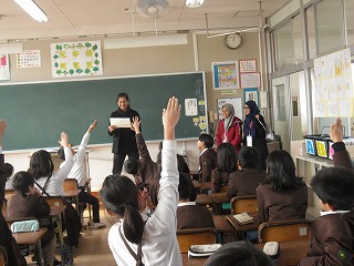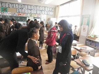 4、5、6年それぞれで、あいさつの後に自己紹介を聞いて、名前は?どこから来たのか?何歳なのか?そして、好きなことは何か?と、聞き取り、マレーシアからきた15歳と16歳の女の子ということが分かりました。