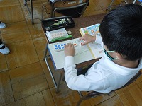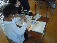 1年生が、繰り上がりのある足し算の学習をしていました。数図ブロックを使って、10のまとまりを作るとわかりやすいことを理解していました。