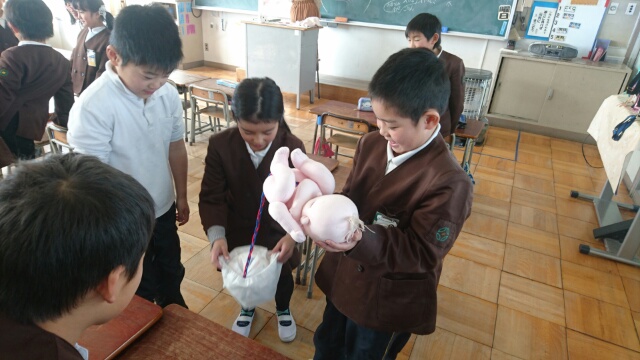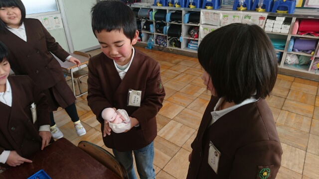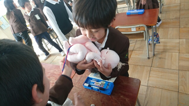 2年生は生活科で、じぶんが生まれたときからの成長について学習しています。お母さんのおなかの中で、どんな風に成長していったのか、実際と同じくらいの大きさ、重さの人形をだいて、実感しました。