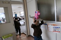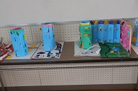 図工の、「まどからこんにちは」が完成し、みんなが図工室に並べていました。丸いビル、四角いビル、びょうぶのようなビルなどさまざまで、窓の形もいろいろな面白い形が並んでいます。
