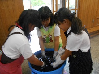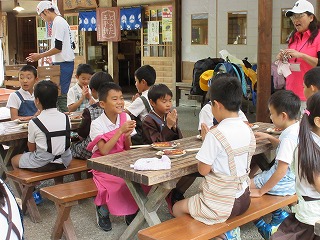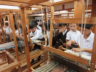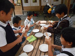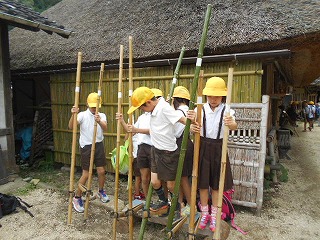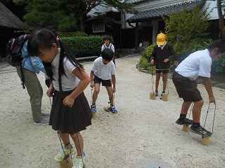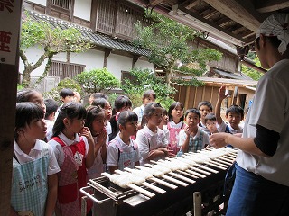 3年生は校外学習に出かけました。行先は、三州足助屋敷。とてもおいしい大きな五平餅も作って食べました。作り方を教えてくださったお兄さんを、子どもたちは「師匠、師匠」と呼んで盛り上がっていました。また、竹とんぼ・コースター・風ぐるま・藍染めの体験をしたり、昔遊びの道具で遊んだりしました。