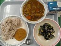 (五穀ご飯)あいさいさんカレー 牛乳 さつまいもコロッケ ひじきと大豆の和風サラダ