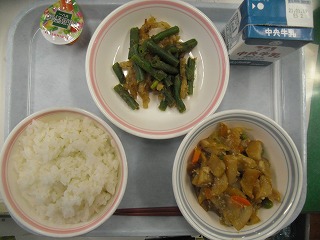 ご飯 牛乳 揚げジャガイモのそぼろ煮 インゲンのおかか和え オレンジ一口野菜ゼリー