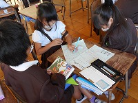1年生が、新しく後期の係を決めて、活動用の名簿と掲示物を作成していました。どんな絵にするか同じ係の子と一緒に相談しながら作っていました。