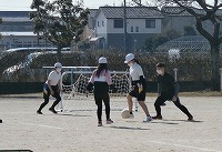 6年生が体育でミニサッカーに取り組んでいました。人数が少なく、コートが小さいので、どんどん動いてパスを回さないと敵が詰め寄っています。