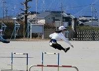 下の写真は後ろ足がないように見えるほど横に上がっています。ここまで足を上げられると、ハードルを低く速く跳び越えることができます。