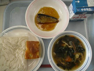 越津ねぎと油揚げのきしめん 牛乳 秋刀魚の生姜煮 リンゴとさつまいものケーキ