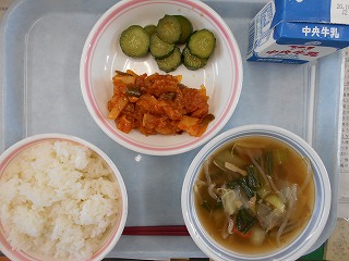 ご飯 牛乳 野菜たっぷりエビチリ きゅうりの香り和え ワンタンスープ