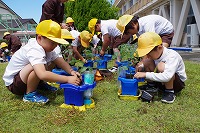 2年生の学習で,JAから野菜名人の方をお招きしました。植え方や育て方などを教えていただき,ミニトマトの苗を植えました。また,他の野菜の苗も畑に植えました。これから元気に大きく育つように,毎日水やりを忘れずに行いましょう。