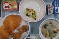 冬休み前の最後の給食であるクリスマス献立を紹介します。まずはクリスマスの定番「フライドチキン」ですが、なんと調理員さんの手作りです。「カラフルサラダ」はパプリカの赤、ブロッコリーの緑、ドレッシングの白などクリスマスカラーを意識したものです。体のあたたまる「豆乳クリームスープ」には冬野菜がたっぷり入っています。そしてデザートとして皆さんお待ちかねの「クリスマスケーキ」がついています。今回はストロベリー味です。