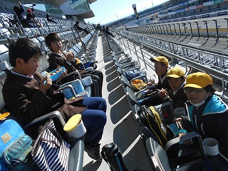 最初に工場で自動車の生産の様子を見学しました(ただし写真は撮影できませんでした)。そして、鈴鹿サーキットのグランドスタンドでお弁当を食べ、午後は鈴鹿サーキットの見学です。いくつか乗り物も体験でき、楽しくすごしました。