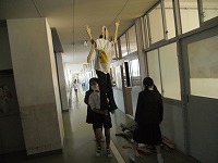 4年生の作っている等身大の自分は、等身大ゆえに運ぶのが大変です。持ち上げるのはもちろんてこの原理で重さが持ち手にかかり、移動するときも天井にぶつからないように気をつけ、出入り口を出たり入ったりするときも、戸に引っ掛けないように気を付けなければいけません。