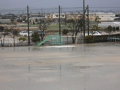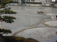 写真ではわかりにくいかも知れませんが、塩化カルシウムをまいた運動場は雪が融けて水になっていますが、まいていない運動場南のジャングルジムの前の砂場や、国旗掲揚塔の下の芝生のあたりは雪が融けず白いままになっています。