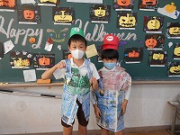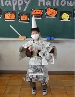 今日はハロウィーンです。学校は休みですが、4年生が昨日ハロウィーンらしく仮装して楽しみました。色画用紙や新聞紙などの材料を工夫して作りました。