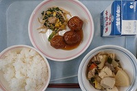 ご飯 牛乳 芋煮(いもに) 愛西蓮根つくね 春菊とツナの和え物